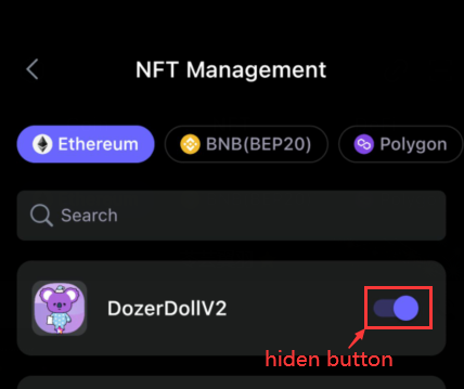 اگر میخواهید NFT خود را پنهان کنید، روی «Manage NFTs» کلیک کنید و روی دکمه پنهان کردن در سمت راست سمت راست NFT کلیک کنید، NFT پنهان میشود و در صفحه داراییهای NFT شما نشان داده نمیشود. اگر می خواهید NFT را باز کنید، دوباره روی دکمه Hide کلیک کنید.
